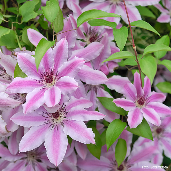 Der Schnitt erfolgt etwa ½ cm über einem Blattknospenpaar. Und was mögen Waldreben sonst noch so? Feuchte Füße und Sonne im Gesicht. Das heißt: Der Boden im Wurzelbereich sollte nie ganz austrocknen und stets im Schatten liegen (Mulchen ist eine gute Hilfe; Staunässe jedoch vermeiden). Die meisten Sorten sind sehr sonnenverträglich, kommen aber auch mit lichtem Schatten zurecht. Clematis sind in vielen bewährten und beliebten Sorten zu haben. Wer allerdings neue Bekanntschaften schließen möchte, probiert die dicht gefüllte, dunkelviolett-blaue 'Franziska Maria'®, die hellblaue Sternen-Waldrebe 'Crystal Fountain'™ mit langen, fast weißen Staubfäden oder die elegante rosafarbene 'Ooh La La'™ mit dunklerer Mittelrippe.