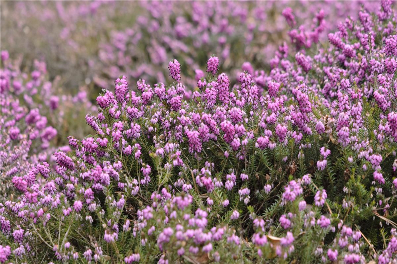 Die glockigen Blüten der Winterheide sind rosa bis fleischfarben und messen etwa fünf bis sieben Millimeter. Bereits im November und Dezember können die Blütenknospen der Schneeheide Farbe zeigen, während die Hauptblütezeit von Februar bis März reicht und gelegentlich bis April andauert.