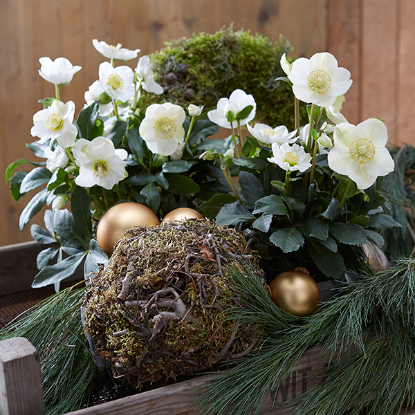 Christrosen (Helleborus) gehören zu den traditionellen Blühpflanzen in der Weihnachtszeit – für drinnen als auch draußen. Über viele Wochen hinweg bereiten ihre Blüten Freude, vorausgesetzt sie befindet sich an einem kühlen Platz. Verziert mit Tannenzweigen und -zapfen, Moos und Christbaumkugeln kommen ihre weißen, porzellanartigen Blüten besonders gut zur Geltung.