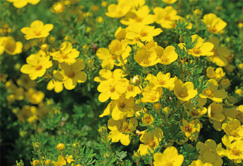 Ob einzeln oder in einer Gruppe gepflanzt, der pflegeleichte Fingerstrauch (Potentilla fructicosa) ist nicht nur in großen oder kleinen Gärten einsetzbar, er verziert auch mit seinen Blüten von Mai bis Oktober Terrasse und Balkon. Während langanhaltender Hitzeperioden benötigt der Fingerstrauch regelmäßige Wasserzugaben. Der Boden sollte nicht austrocknen, Staunässe aber vermieden werden. Besonders schöne Blütenfarben liefern die Sorten 'Bello Sol®', 'Princess®' und 'Bella Lindsey®'. Alle Sorten beeindrucken durch ihre Blühfreudigkeit und Anspruchslosigkeit.